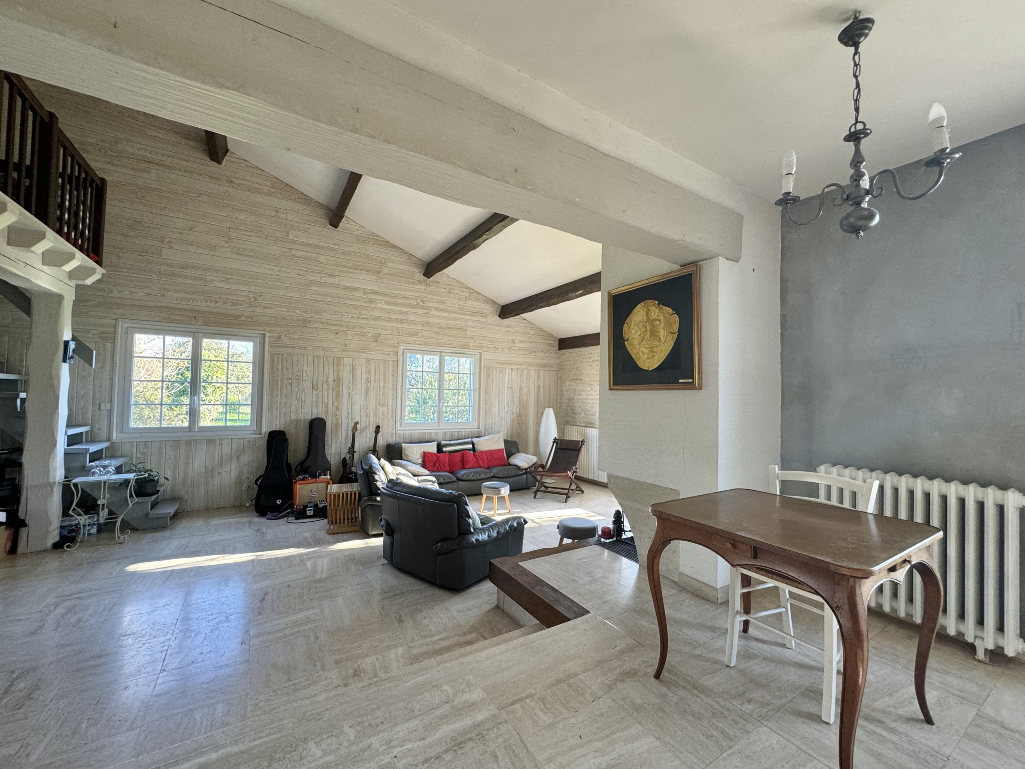Cette maison d’environ 177m² propose de vivre en partie de plain-pied, avec 5 chambres dont une avec un point d’eau et trois avec des portes fenêtres accédant directement sur la terrasse, une buanderie, une salle de bain, un wc indépendant, une grande pièce de vie d’environ 55m² avec une mezzanine et une cuisine séparée.